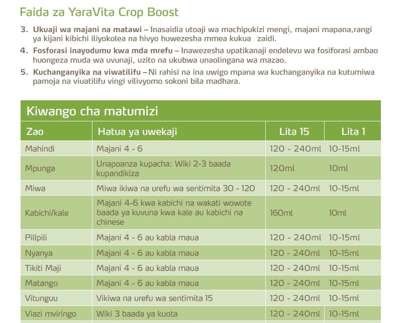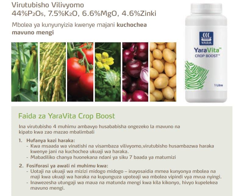 Mbolea ya kukuzia kwa mazao yote, inayotumika kunyunyizia kwenye majani yenye phosphorus nyingi inayotoa uwiano wa lishe muhimu inayoongezea mmea kujipatia chakula kingi toka ardhini kwa: